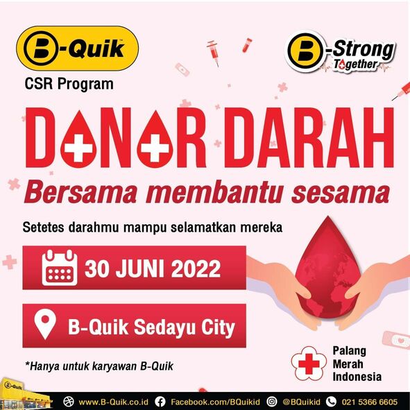 Pada tanggal 30 Juni 2022, B-Quik mengadakan event Donor darah yang bekerja sama dengan PMI ( Palang Merah Indonesia ) hanya untuk Lingkungan internal B-Quik. Kami mengundang beberapa karyawan kami untuk menjadi bagian dalam mendonorkan darah mereka. Ini adalah event pertama kami dimana kami melakukan kontribusi dan memberikan aksi sosial ke masyarakat, dan yang pasti akan ada event - event sejenis yang akan datang! B-Quik B-Strong Together!